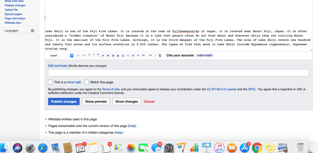 Finally, I searched my topic in the search engine on Wikipedia and clicked add entry. Then, I began to write about Lake Shoji. Below is my entry before I attempted to publish it.
